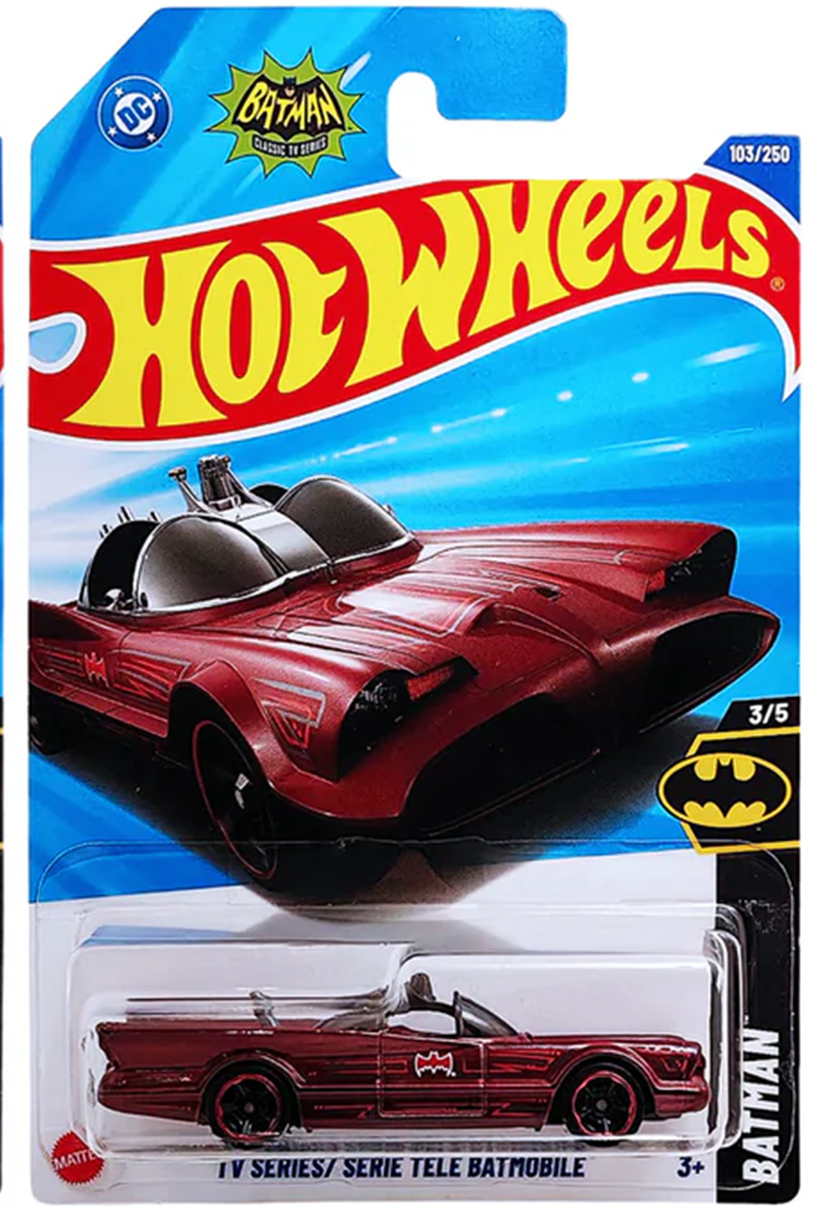 Holy Hot Wheels, Batman! The legendary TV Series Batmobile is back in sleek 1:64 scale, ready to chase down villains and save Gotham City in style. Inspired by the iconic 1966 Batman TV show, this collector-favorite features classic black paint, red pinstriping, and all the signature details from the original crime-fighting machine — from the bubble windshield to the bat-emblems on the doors.