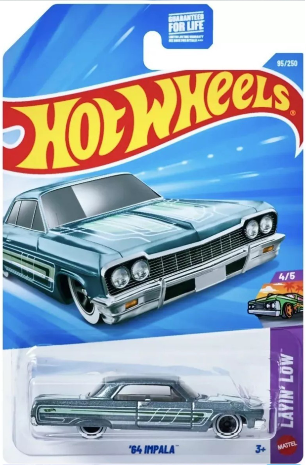 The Hot Wheels Layin’ Low ’64 Impala (1:64 scale) is a stylish diecast model inspired by the legendary Chevrolet Impala, a true icon of 1960s lowrider and classic cruiser culture.This version, themed “Layin’ Low,” showcases the ’64 Impala in a lowered stance, emphasizing its smooth body lines, long profile, and signature convertible or coupe styling (depending on release). Hot Wheels enhances the look with custom paintwork, detailed trim, and a lowrider-inspired aesthetic that highlights its street-cruising heritage.Built with a durable diecast metal body, this casting is a favorite among collectors who enjoy classic American cars and custom culture designs. It appears in various Hot Wheels series, often featuring different color variations, wheel styles, and special deco treatments.