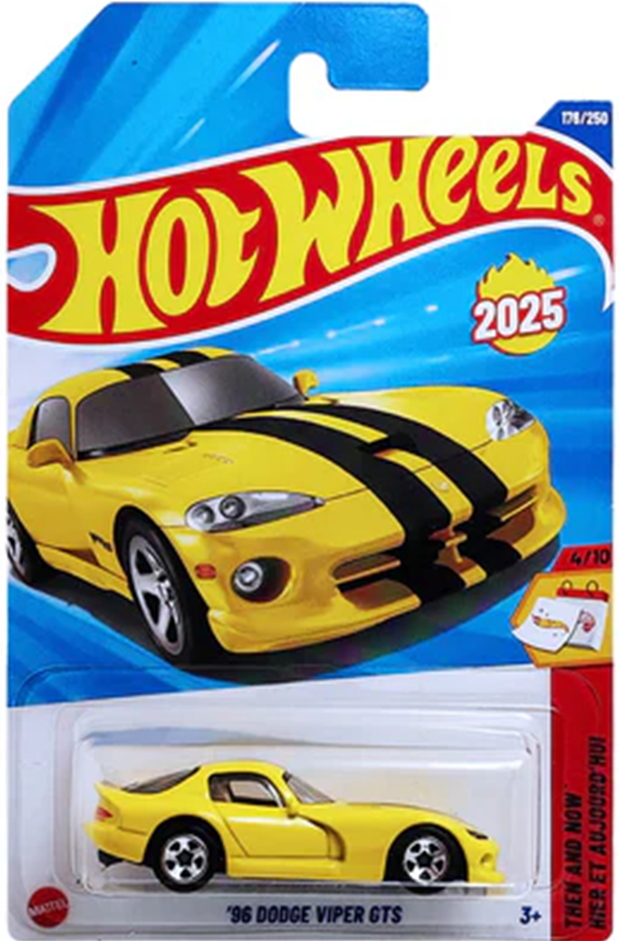 Celebrate an American performance icon with the Hot Wheels Then and Now / Hier et Aujourd’hui – ’96 Dodge Viper GTS. This 1:64 scale collectible captures the bold curves, aggressive stance, and unmistakable racing stripes that made the Viper a legend of the 1990s. With detailed sculpting, vibrant paint, and authentic Hot Wheels craftsmanship, this model is a standout piece for muscle car fans and collectors alike. Whether displayed on its own or paired with its modern counterpart in the Then and Now series, the Viper GTS brings timeless power and style to any collection.